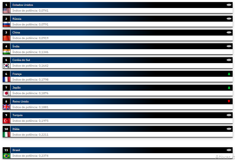 Com índice de poder (PwrIndx) de 0.2374, o país aparece à frente da Alemanha (12º) e do Paquistão (14º), em um ranking onde números mais próximos de zero indicam maior capacidade militar.