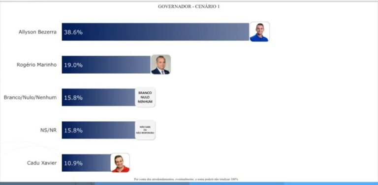 No cenário estimulado, ele aparece com 38,6% das intenções de voto, à frente de Rogério Marinho (PL), com 19%, e Cadu Xavier (PT), com 10,9%.